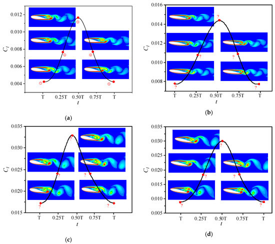 In order to further analyze why the influence of K-value on airfoil aerodynamic performance is completely the opposite when α = 8° and α = 12°, we assessed vorticity for K = 0, α = 8°; K = 0.6, α = 8°; K = 0, α = 12°; and K = 0.6, α = 12° at five selected moments (0 T, 0.25 T, 0.5 T, 0.75 T, and 1 T) in a stable cycle in each of the four working conditions, as shown in Figure 7. It can be seen from the figure that when the vortex on the suction surface (clockwise) is falling off, vortices on the pressure surface (anti-clockwise) are gradually generated and the lift coefficient increases gradually. As the vortex on the suction surface completely falls off, the lift reaches the maximum. At this time, the vortex on the pressure surface begins to fall off, vortices on the suction surface begin to form, the lift coefficient decreases gradually, and as the vortex on the pressure surface completely falls off, the lift coefficient reaches the minimum.