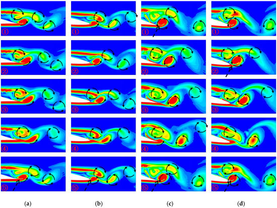 The aerodynamic performance of an airfoil is affected by the size of the vortex and the position of vortex generation/shedding. In order to analyze the influence of the airfoil with a blunt trailing edge on vorticity, the vorticity diagram of the airfoil trailing edge was analyzed, as shown in Figure 8. It can be seen from the figure that the value of K affects the size of vortices and the position of vortex generation/shedding. When α = 8°, the airfoil with a blunt trailing edge (K = 0.6) generates smaller vortices, and the vortices on the suction surface and pressure surface are located at the rear of the trailing edge (Figure 8b-⑤). The vortices generated by the trailing edge of the original airfoil (K = 0) are larger and are all near the suction surface (Figure 8a-⑤). The shedding/generation of vortices will have a greater impact on the aerodynamic performance of the airfoil. When α = 12°, this phenomenon changed. The vortices generated by the K = 0 and K = 0.6 airfoils are near the suction surface, and the vortices generated by the K = 0.6 airfoil pressure surface are closer to the suction surface (Figure 8c-⑤,d-⑤). When the position of the vortices generated by the suction surface is the same (Figure 8c-①,d-②), the lift coefficient is the same (Figure 7c-①,d-②). It was also found that the closer the vortices generated by the pressure surface are to the suction surface, the smaller the lift coefficient is. The lift coefficient increases with the clockwise vortex fall-off. As shown in Figure 7 and Figure 8, when α = 8°, the shedding position of the wake vortex with K = 0.6 is farther from the airfoil. With the increase in the angle of attack to α = 12°, the shedding position of the wake vortex with K = 0 is farther from the airfoil. Under the same K-value, the shedding distance of the wake vortex decreases with the increase in the angle of attack. Under the same Reynolds number, the farther the shedding position is, the greater the shedding frequency is, which corresponds to the St number in Figure 6f.