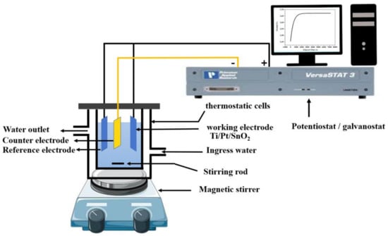 All the electrochemical experiments (voltammetry and electrolysis) were carried out in an undivided and thermoregulated electrochemical cell of 200 mL and connected to a Versa studio type potentiostat/galvanostat. The electrochemical cell, shown in Figure 2, consists of a reference electrode (Hg/Hg2Cl2/KCl), a platinum wire as counter electrode and a working electrode (used as anode) of Ti/Pt/SnO2 (mesh of 2 cm2). The anode and cathode were positioned vertically and parallel to each other with a space between the electrodes of 1.5 cm.