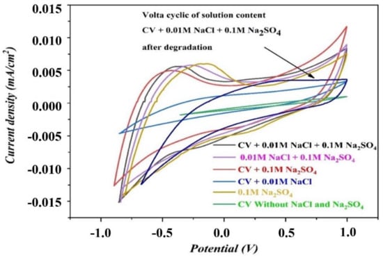 In fact, one can notice that after a 30 min treatment time, the rate reached a value of 91% for a sodium chloride concentration of 0.01 M NaCl + 0.1 M Na2SO4, 95% at 0.03 M NaCl + 0.1 M Na2SO4, 96% at 0.05 M NaCl + 0.1 M Na2SO4, and 98% for the 0.1 M NaCl + 0.1 M Na2SO4 concentration. However, after 2 h of treatment, a percentage of 100% was observed for the concentrations 0.01 M, 0.03 M, 0.05 M NaCl electrolyte.