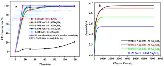 (a) Effect of NaCl concentration on degradation of the CV solution; (b) chronopotentiograms during electrolysis of the CV solution ([CV]0 = 10 mg L−1, initial pH = 7, i = 50 mA cm−2 and temperature = 25 °C).