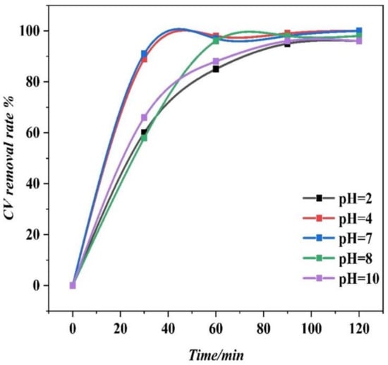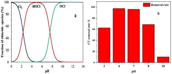 In order to understand the differences depending on the pH value, a comparison of the CV removal rate with the preponderance diagram of the chlorinated species (Figure 6a [47]) was performed.