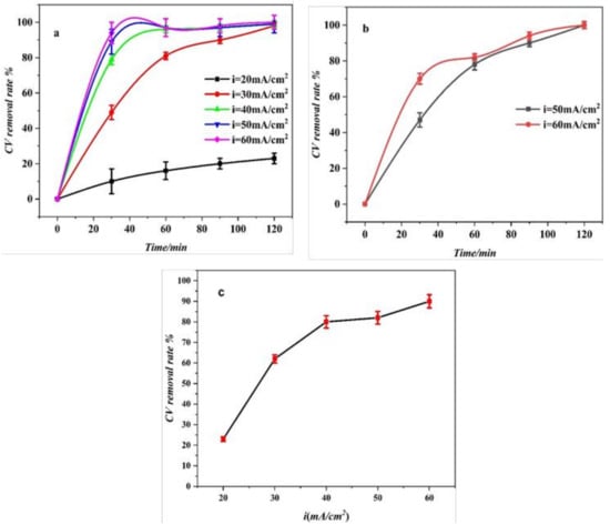 Effect of current density on efficiency of dye CV removal: pH0 = 7, T = 25 °C (a) [CV]0 = 10 mg L−1; (b) [CV]0 = 50 mg L−1; (c) CV removal rate vs. current densities ([CV]0 = 10 mg L−1, initial pH = 7, temperature = 25 °C, Q = 7.2 C/cm2).