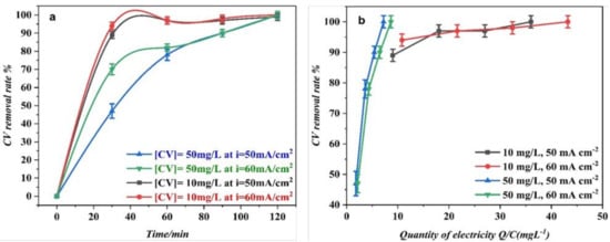 More specifically, Figure 8b highlights the CV abatement rate for the two initial concentrations as a function of the electrical charge in C/(mg L−1) for 50 and 60 mA cm−2. This comparison of the data highlights a perfect superposition of the values for both currents and that an electrical charge of 7 C (mg/L) is sufficient to remove more than 90% of the dye.