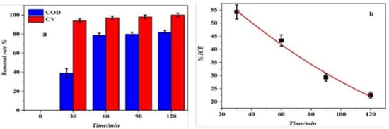 Afterward, the instantaneous current efficiency (ICE) during crystal violet degradation process was calculated by the following Equation (10):
