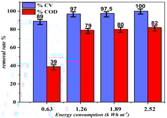 On the other hand, Figure 10 shows the energy consumption as a function of removal for CV and COD. As expected, it can be noticed that the energy consumption increases significantly to reach the ceiling values of removal. Further, 97% decolorization and 79% COD removal are achieved after 60 min of treatment, i.e., an energy consumption of 1.26 kW h m−3, while 2.52 kW h m−3 (i.e., 120 min.) are needed to increase the CV and COD removal of 100% and 82%, respectively. As a result, electrochemistry can be used for the treatment of dyes. To render the process as economical as possible it is very important to establish specifications on the quality of the treated water in order to define stopping criteria.
