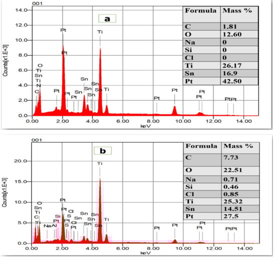 The comparison of Figure 11a,b evidences that the surface of the samples has been changed after use with the formation of a film on the Ti/Pt/SnO2 electrode surface. To analyze the composition of the surface, EDX analysis, shown in Figure 12, were performed. The appearance of intense peaks attributed to the Ti, Pt, Sn elements on the EDX spectra shows that some part of the electrode substrate appear at initial state (before using) and the composition of O and C elements are higher after electrode use which reveal the adsorption of organics or polymer formation on the electrode surface.