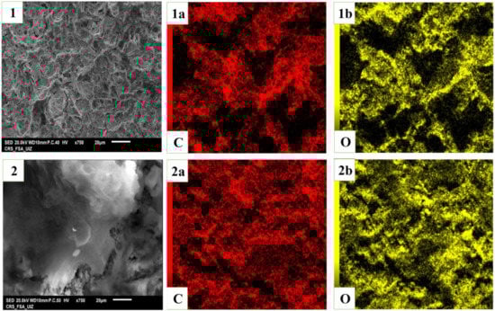 Elemental mapping images of Ti/Pt/SnO2 electrode by SEM: (1) before electrolysis, (2) after electrolysis, (C: Carbon, O: Oxygen).