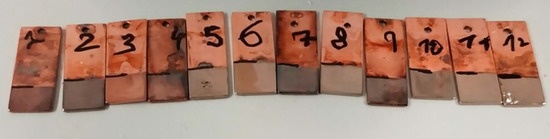 The copper substrates (pure copper, dimensions 50 mm × 10 mm × 1 mm) used in the entire work were pre-treated using different steps. Pre-treatment of the copper substrates was an irreplaceable step due to the copper oxide layer that naturally formed over the entire surface, which passivated it, blocking the galvanic exchange reaction between copper atoms and palladium ions, which produced the electroless deposited film.