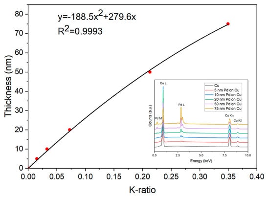 The calibration curve for the thickness determination was built simulating the following thicknesses of palladium on copper: 0 nm, 5 nm, 10 nm, 20 nm, 50 nm, and 75 nm (Figure 2 inset). The simulated points are not equally spaced because the correlation between thickness and K-ratio is exponential; in this way, the fitting is more reliable and optimized, keeping the number of points low. For low metal thicknesses, the correlation between the K-ratio and the thickness values can be approximated by a second-grade equation which provides a simpler regression maintaining a high reliability (R2 > 0.999).