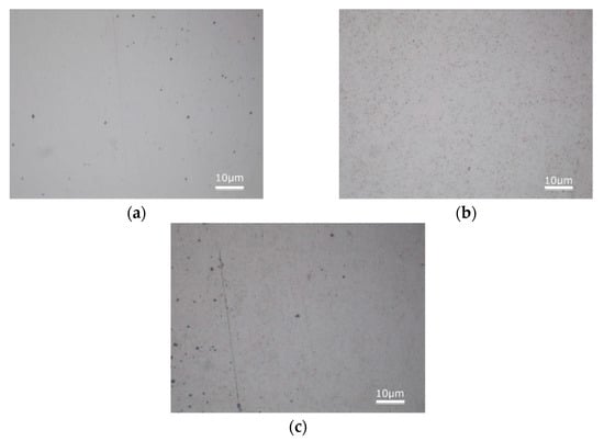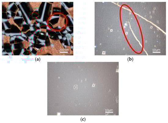 OM images of sample (a) #6C; (b) #8C and (c) #10C are shown in the figures. For samples #6C and #8C the presence of cracks can be observed (e.g., the features highlighted by the red circles) while for sample #10C the surface results were smooth and free of defects.