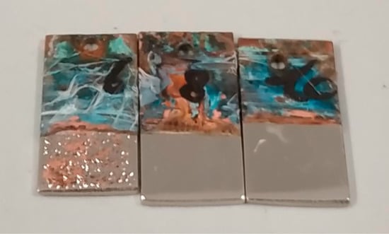 Palladium chemical plating samples after 7 days of aging. Sample number is reported on the uncoated part of each sample (from left to right, samples #6C, #8C, #10C).