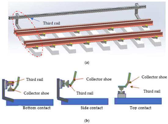 (a) Third rail setup and (b) types of collector shoe and third rail contact arrangements.