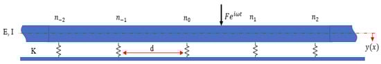 Moreover, the third rail can be modelled as an infinite beam that is periodically supported by springs separated by a distance d [8,17,20], as illustrated in Figure 3. Analysis for the periodically supported beam is also described in [10,18,21]. A general approach is to account for the reaction forces at each support point that is exerted by individual deflected springs on the beam. If the deflection/bending of the beam at the support point is , the beam experiences a reaction force equivalent to , where K is the stiffness of the supporting springs. The procedure to estimate the equivalent spring stiffness for the third rail support structure was explained in Section 2.