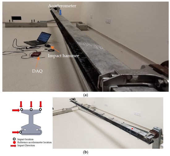 A roving hammer impact approach is adopted for laboratory modal testing of the third rail. The third rail is impacted at different locations using an impact hammer while keeping the accelerometer sensor’s position fixed. The length of the third rail was divided into 11 sections. For each section, the third rail is impacted at five different locations. The laboratory setup of SMRT third rail, impact locations, accelerometer position, and direction of impact is shown in Figure 4a. The SignalCalc [21] analyzer was used to acquire the data from the accelerometer and the impact hammer. Thereafter, MEScopeVES [22] software was used to further process the data. The experimental procedure has a few steps including collection of frequency response functions (FRFs) by striking the hammer at selected impact locations along the rail and aggregating the complete dataset into the analysis software, MEScopeVES. Impact hammer strikes act as an excitation input to the structure, and the response in time domain is captured using an accelerometer. The captured data are then converted into frequency domain [23]. A dataset of 54 FRFs was collected in this experiment. The dataset was then used in MEScopeVES software along with a CAD model of the structure. MEScopeVES software analyses the imaginary part of the FRF to extract the amplitude and direction of the response. Moreover, the software also extracts parameters such as frequency and damping [24,25]. The software then combines the CAD model of the structure and extracted modal parameters to visually present mode shapes. In this way, the mode shapes and corresponding frequencies were obtained for the single-span third rail using the experimental data.