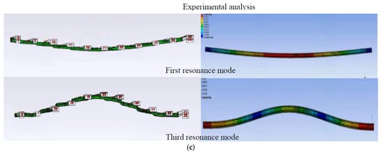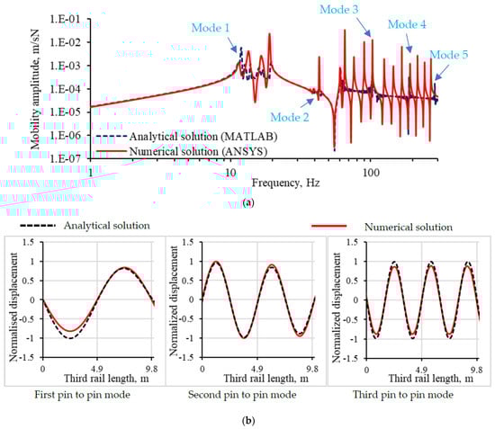 Figure 5b presents the mode shapes of the first three pin-to-pin modes obtained from both analytical solution and Ansys simulation. A two-span length of the third rail was shown to illustrate the mode shapes. In ANSYS modal analysis, the displacement of the beam is arbitrarily scaled. Therefore, the results from both the analytical and numerical solution are normalized by the maximum value. The results show how a point will be deflected or displaced relative to another.