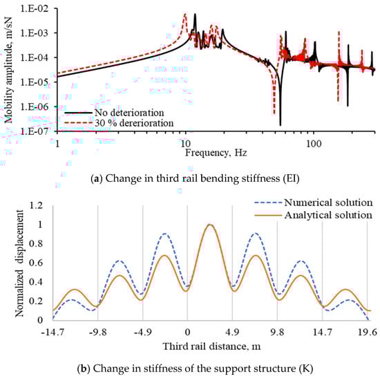 Strong railway vibrations could produce damaging effects on structural components of the rail [11]. Similarly, the third rail resonant vibrations can easily degrade the third rail and its components such as brackets, insulators, or claws over time [17]. Such vibration-induced damages can cause fatigue failure and greater wear and tear, as well as reducing the stiffness of the third rail and the supporting structures [27]. Mathematically, it can be modeled by reducing the bending stiffness (EI) for the third rail and the spring stiffness (K) for the support structures. An effect of structural deterioration on its dynamic performance is illustrated in Figure 6.