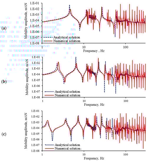 Figure 5a compares the numerical solution for the spring-supported multi-span third rail model and the analytical solution of the mathematical model. The analytical solution is for the point mobility of the third rail due to a unit harmonic force at mid-span, i.e., . It should be noted that no damping properties of either the third rail or the supporting structures/springs were considered in this analysis.