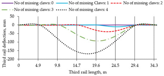 Missing claws or supporting components increase the sagging of the third rail and, therefore, exert excessive contact force on the current collector shoes. Excessive contact forces could cause the twisting of the collector shoes, leading to loss of contact with the third rail and interrupting the power supply to the train. The sagging of the third rail and the contact force depends on the number of dropped or missing claws. The deflection of the third rail for a number of missing claws was simulated in ANSYS. The results are presented in Figure 9. With no missing claws, the maximum deflection of the third rail was less than 1.2 mm, which corroborated with the design criteria of the SMRT third rail to limit the third rail deflection below 1.5 mm [28,29] For more than two damaged or missing claw structures, the deflection increased sharply and was found to be about 170 mm in the case of four missing claw structures. Similar results were reported in an investigation conducted by SMRT to inquire the causes of power disruption in train services [28].