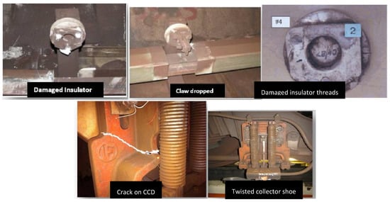 As expected, the sagging of the third rail increases with the increasing number of missing claws. However, it is interesting to note that the sagging increases much more as the number of missing claws increases. As the contact force on the collector shoes increases with the sagging, more than two missing claws can exert a considerably higher force than normal operating conditions. This will increase the possibility of bottoming out the current collector device’s suspension and damaging the collector shoes. Figure 10 shows the damage and failure of the structural components and current collector shoes because of excessive contact force due to excessive sagging of the third rail.