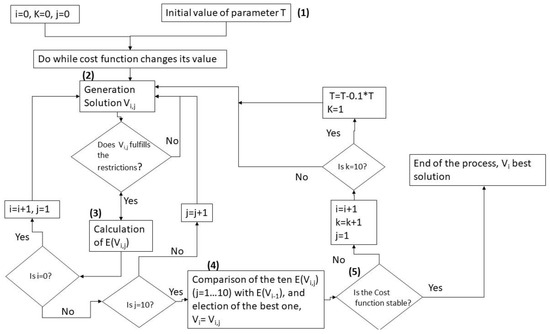 The process begins by establishing the initial value of the parameter T of the simulated annealing method (step 1 in Figure 2). This is the highest value of the cost function for a number of previously calculated alternatives and is modified by 10% every ten interactions [44].