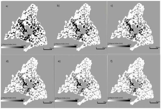 Here, is the collapse index in the Madrid Region for pixel i and alternative Vi,j, and CCI is the reference collapse index, which is 10,000 min in this study.