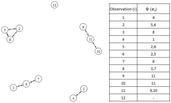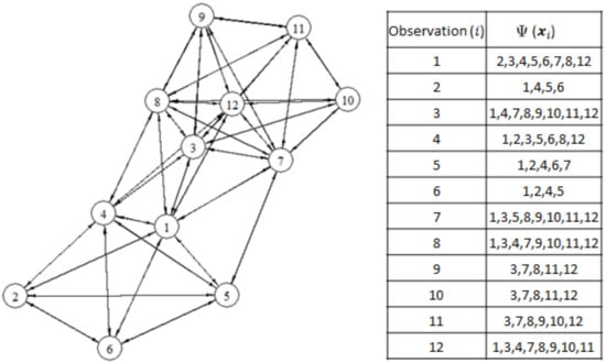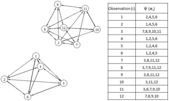 where represents the dissimilarity measure between node and , and is the kth smallest dissimilarity measure from node to the other nodes. Then, from Equation (4), a mutual neighborhood set of nodes , is given by: