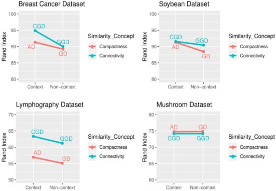Figure 4 presents a visual comparison using the result of the Rand index in Table 1 and categorization in Table 6. Except for the Mushroom dataset, in general, the dissimilarity measures with context-based method considering the correlation between categorical variables (such as AD and CGD) show better performances than others (such as GD and GGD). This result may indicate that since these three datasets (Breast cancer, Soybean, Lymphography) have highly correlated categorical variables (as shown in Table 4, that is, dependency factor () for Breast cancer 100%, Soybean 61.18%, and Lymphography 47.76%), the context-based methods outperform the non-context-based methods. In addition, the dissimilarity measures that consider the concept of connectivity of data observations (such as GGD and CGD) perform better than those that do not (such as GD and AD). This result may also indicate that these three datasets have clusters of complex shapes in their manifold structure.
