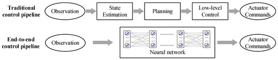 In Figure 2, the traditional control pipeline is presented, along with its modularization. To obtain the actuator commands on the basis of observation, usually, the state estimation, planning, and low-level control stages need to occur. This requires a series of independent modules, and the interfaces between different modules need to be handcrafted. By comparison, our proposed method is based on the end-to-end control pipeline. The core idea is to establish a direct mapping between the input-end (observation) and the output-end (actuator commands) of the system on the basis of the neural network. The end-to-end control pipeline simplifies the control process and is expected to autonomously extract the features that are supportive to the generation of the proper control commands.