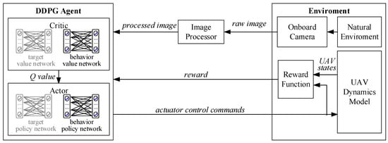 Specific to the UAV control instance presented in this paper, the problem was abstracted as an image-based reinforcement learning problem in Section 3.2. To apply the proposed end-to-end control pipeline, the policy for the RL-agent is approximated by a neural network. To obtain the continuous action, the deep deterministic policy gradients (DDPG) algorithm with the actor-network and the critic-network is adopted. Therefore, the UAV perception-based control problem can be described in the image-based RL framework, as shown in Figure 3. Apart from the DDPG agent, the environment mainly consists of the external environment and the UAV model. The interaction between the two main parts is achieved by the environment interfaces, including the onboard camera and the reward function. The former is used to obtain the monocular image and the latter calculates the reward according to the control commands and UAV states. The raw image from the camera is an RGB image with a size of 640 × 480. In consideration of computational efficiency, it needs to be resized and converted to greyscale by the image processor.