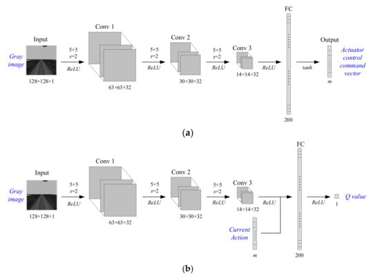 The architectures of the neural network designed for the DDPG agent in this paper are shown in Figure 4. The input and the output variables are noted in blue. The actor and the critic have a similar network architecture that consists of convolution layers and fully connected layers. The inputs of both of the networks consist of the pre-processed grey image from the downwards camera with the size of 128 × 128. To extract the features of the runway from the whole scene, 3 convolutional layers are used with max-pooling and the ReLU activation function. The size of the filter in each layer is 5 × 5. To reduce computation, the stride is set as 2. The output of the convolutional layers is finally given to the fully connected layer and then activated by tanh function for the output layer to keep the control commands within a fixed range. For the actor-network, its output is an m-dimensional vector in which each element corresponds to the control command of the respective actuators. The value of m is determined according to the specific mission and controlled object. For the critic-network, the current action vector is used as an additional input for the fully connected layer. In addition, its output is activated with ReLU function to produce a scalar that represents the estimated Q-value.