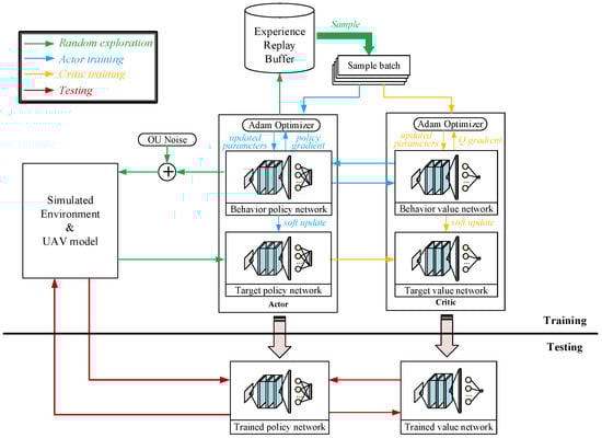 With the designed network architecture and the reward function, the DDPG algorithm can be implemented for the image-based autonomous landing task, and its diagram is shown in Figure 5. In the figure, arrows with different colors represent the data flow during different phases of the algorithm. In the beginning, the parameters of the networks are randomly initialized. The UAV starts from the designated initial position with certain velocity and attitude.