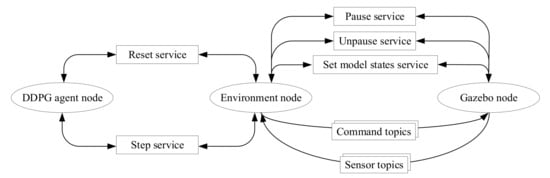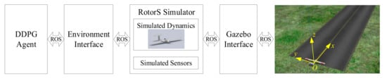 As shown in Figure 7, the simulated environment includes the runway on the ground and the UAV model. The centerline of the runway starts at the origin point (0, 0, 0) m and overlaps with the x-axis of the global coordinate system. The UAV model is the Techpod model provided by the RotorS simulator, including the inner loop controllers and basic sensors. Additionally, a downwards camera is attached to the model by editing the corresponding file to obtain the images. The overall system contains three main nodes: the DDPG agent node, the environment node, and the Gazebo node. The communication among the nodes is realized by publishing or subscribing to topics and services. The computing graph of the program that describes the nodes’ relationship is shown in Figure 8.