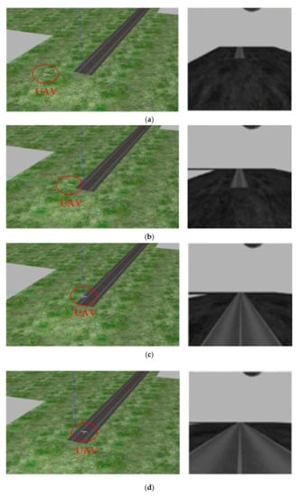 For the first case, the initial position of the UAV is (−25, 0, 12) m. The initial deflection angle of the left and right ailerons, the elevator, and the flaps of the UAV is −0.35 rad. In addition, that of the rudder is 0 rad. The initial velocity along the x-axis is 10 m/s. There is no disturbance outside. The border of the x-axis is [−30, 50] m and for the y-axis it is [−10, 10] m. The screenshots during the landing and the corresponding processed images are shown in Figure 9.