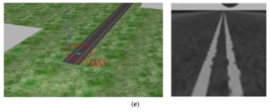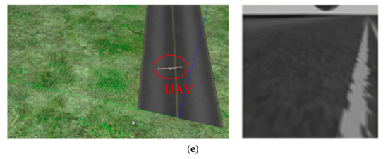 For the third case, the initial position of the UAV is (−4.5, 28, 12) m. The initial deflection angle of the left and right ailerons, the elevator, and the flaps is −0.35 rad. In addition, that of the rudder is 0 rad. The initial velocity along the y-axis is −10 m/s. There is no disturbance outside. The border of the x-axis is [−10, 50] m and for the y-axis is [−30, 30] m. Screenshots taken during the landing and the corresponding processed images are shown in Figure 17.