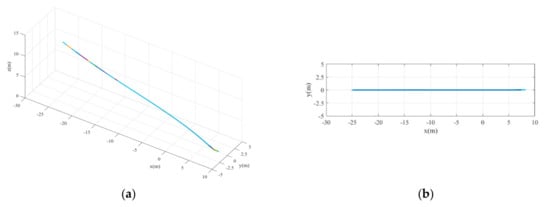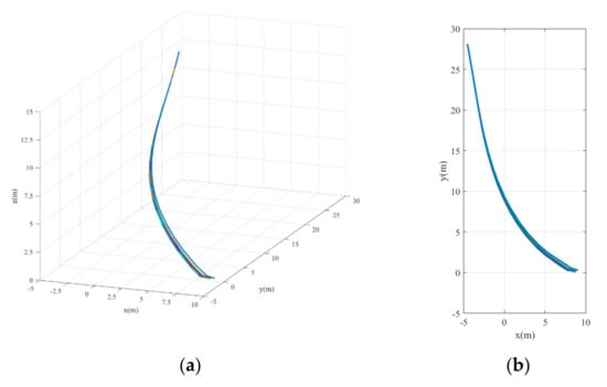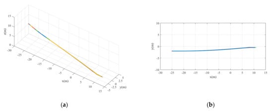 The landing trajectories under case 1. (a) 3D trajectory. (b) 2D trajectory in the x-y plane.