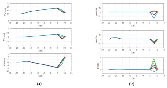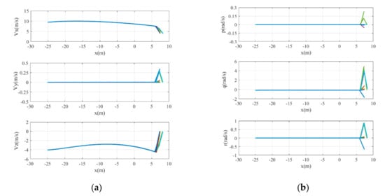 The landing trajectories are shown in Figure 18. They indicate that the UAV makes a turn under this condition and that the distance between the UAV and the centerline of the runway shrinks during its landing. The final height is less than 0.17 m and the lateral error is less than 0.3 m. The curves of UAV states including its global linear velocities () and body rates () varying with position are shown in Figure 19. The velocity of the x-axis first increases and then decreases. The velocity of the y-axis continuously decreases and the yaw rate increases during the adjustment of the heading direction of the UAV. The control commands of the six actuators varying with position are also shown in Figure 20. The rudder has a large negative deflection angle to generate the yaw moment.