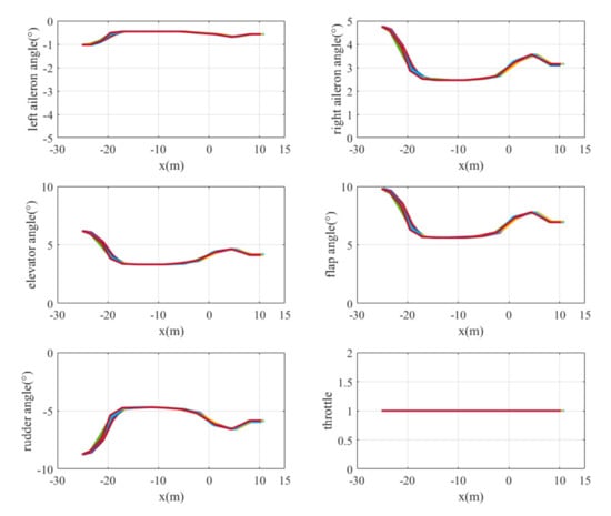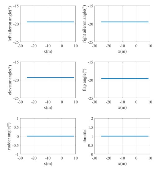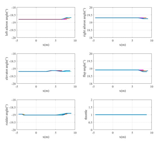The landing trajectories of the mass point of the UAV model are shown in Figure 10. The final height is less than 0.17 m and the lateral error is less than 0.04 m. The curves of UAV states, including its global linear velocities () and angular velocities with respect to the body frame () varying with position, are shown in Figure 11. The y-axis velocity of the UAV is maintained at around 0 m/s, and the angular velocity of the x-axis vibrates at around −0.15 rad/s before touching the ground. It is obvious that the states of UAV change dramatically during the last seconds. The main reason for this is the lack of landing gear, meaning that part of the body always lands first, leading to irregular motion close to the ground. And this phenomenon also occurs in other conditions. The control commands of the six actuators varying with position are also shown in Figure 12. It can be seen that the rudder exhibits little change from zero, which matches the fact that there is no need for the UAV to steer its yaw angle when it starts landing from the point that exactly aligned with the centerline of the runway.