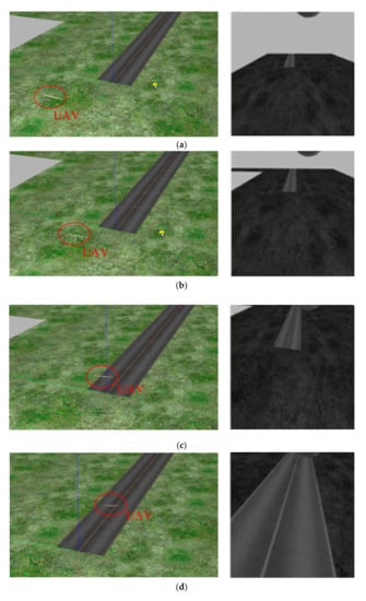 For the second case, the initial position of the UAV is (−25, −2, 12) m. The initial deflection angle of the left and right ailerons, the elevator, and the flaps of the UAV is −0.35 rad. In addition, that of the rudder is 0 rad. The initial velocity along the x-axis is about 10 m/s. There is no disturbance outside. As in case 1, the border of the x-axis is [−30, 50] m and that for the y-axis is [−10, 10] m. Screenshots taken during the landing and the corresponding processed images are shown in Figure 13.