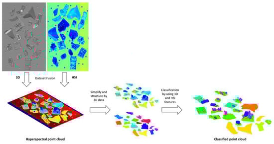 The general concept of the proposed method consists of merging the datasets followed by extracting features in the 3D and hyperspectral domains. Especially the fusion of datasets is a challenging task and poses different requirements (e.g., calibration of line sensors and methods for registration) depending on the sensor technologies used. Hyperspectral sensors with high spectral and spatial resolution are usually line sensors and differ in their imaging properties from frame-based sensors. Accordingly, adapted models are necessary to perform the calibration, which is a required step for the registration of the datasets. Methodologies for the registration of line scanning HSI sensors and 3D Laser Scanners in outdoor applications can be found, for example, in [23,24,25]. The strategy adopted in this article focuses on a laboratory application and follows a simple registration concept that can similarly be applied to an industrial production/sorting process.