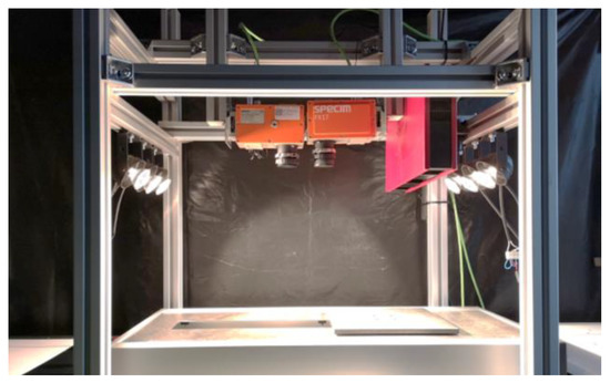 The use of hyperspectral sensors in industrial applications is also conceivable and is particularly widespread in the food industry [39,40,41]. The Specim FX17 sensor used was able to detect 670 FPS at full resolution. It is not always necessary to use the full resolution. By analyzing the data beforehand, spectral ranges or even only a small number of bands can be used, which ultimately leads to a further increase in the detection rate. Important in the context of hyperspectral sensor technology is the illumination unit. This must be installed in the measurement setup in such a way that the 3D technology used is not influenced.
