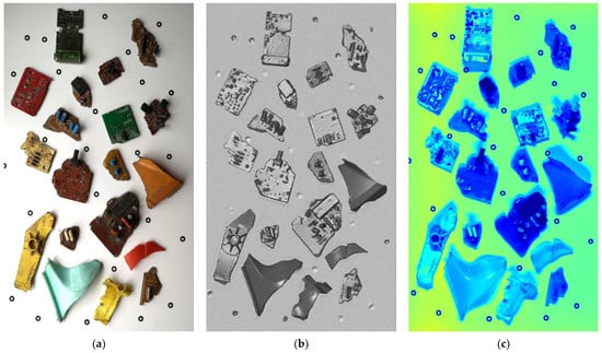 Figure 3. Acquired datasets of electronic waste consisting of waste plastics and PCBs: (a) RGB; (b) 3D point cloud with a resolution of 0.5 mm and a depth accuracy of 0.05 mm; (c) HSI with a resolution of 636 × 1118 pixels and 224 bands in the wavelength range from 900 nm to 1700 nm.