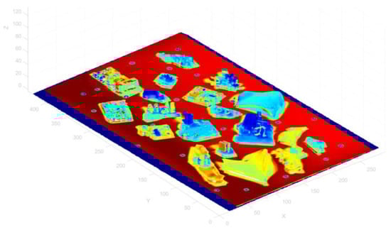 The first step of the proposed framework is the fusion of the datasets (shown in Figure 3) consisting of HSI and 3D point cloud. This is achieved by using tie points. Due to the technical setup of the sensors (fixed sensors looking vertically downwards), the objects are successively captured during one measuring process in both hyperspectral as well as three-dimensional. The transformation parameters are estimated by using tie points that are existing in both datasets and allow the fusion in x-y plane. Due to the different resolutions of the datasets, the assignment between 3D point and spectral signature is made pixel by pixel checking the neighborhood. The result is a 3D point cloud presented in Figure 4 with a spectral signature for each individual 3D point. Even though the sensor technology presented in Figure 2 would not be readily applicable in an industrial context due to the 3D sensor technology used, the potential for the overall concept of the measurement system and fusion strategy for use in industrial practice is given.