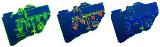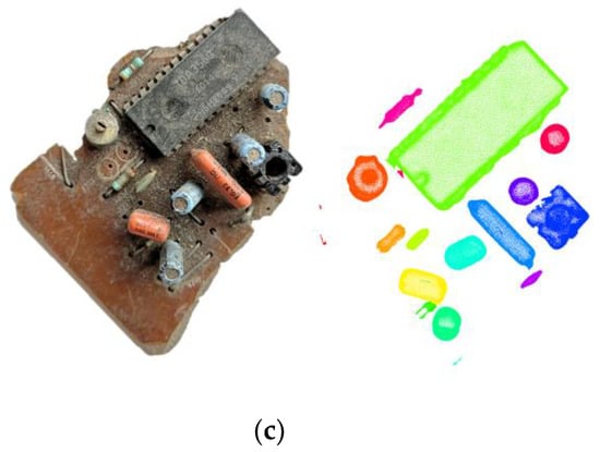 Another advantage of adding 3D data is the possibility to partition the dataset by using cluster methods, which are addressing the shape content of objects. The aim of a cluster analysis is to find structures in a set of arbitrary data with different properties and to discover relationships in order to be able to group objects. This involves forming groups in such a way that the properties of the data within the group or cluster are approximately identical. A variety of cluster algorithms exists in the state of the art for this purpose. The task of cluster algorithms is to form clusters within datasets. Clustering methods differ in their approaches and strategies. This allows the separation of the individual objects in the dataset. Due to the homogeneous data available in our dataset, a cluster approach based on Euclidean distance was chosen for the separation of the individual objects. Cluster methods can be not only used for the individual object’s separation (such as plastics and PCBs, as shown in Figure 6b), but also can be used for the separation of components on the boards (as shown in Figure 6c).