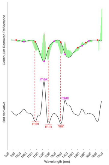 The approach to determine the significant parameters for the description of the spectral shape is presented in Figure 8. It is based on the computation of extreme values of the 2nd derivative. For a better quantification of absorption peaks, the spectral signatures are normalized by using Continuum Removal [32,33].