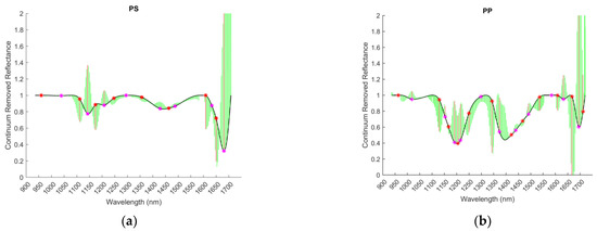 Figure 9. Continuum Removed Reflectance spectra (black line), calculated curvature values (green lines), maximum points with concave behavior (red dots) and minimum points with convex behavior (magenta dots) for (a) Polystyrene (PS); (b) Polypropylene (PP) [31].