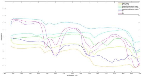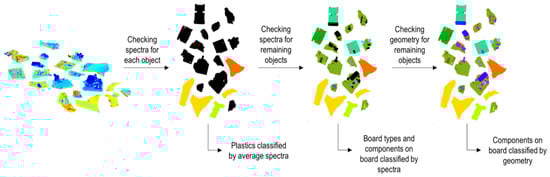 This section shows the steps of the rule-based classification. For a better understanding, an overview of the process is shown in Figure 11. It can be understood as an iterative refinement starting with simple and dominant conditions and continuing in the direction of more complex and composite conditions. The first step of the classification process is based on the knowledge about the spectral behavior of plastics, which is significantly different to those of PCBs. We use this knowledge to separate these two groups and check the average spectrum for each cluster. Since plastic objects are usually made of one material and not of a combination of materials as for PCBs (board and different components), the average spectrum provides a good approach to classify the objects in question (Figure 12). This procedure not only ensures a clean classification of these objects, but also offers advantages in terms of performance, as not every single pixel has to be checked.