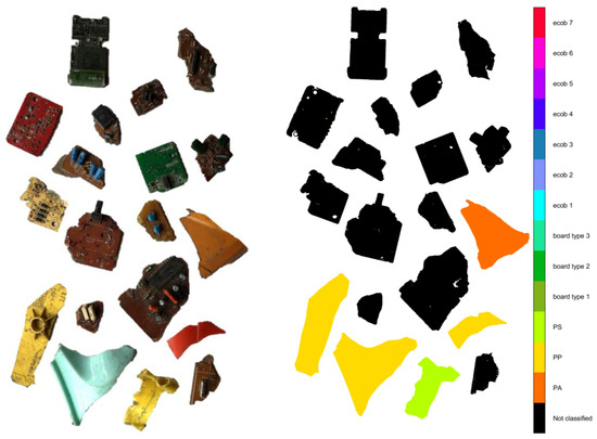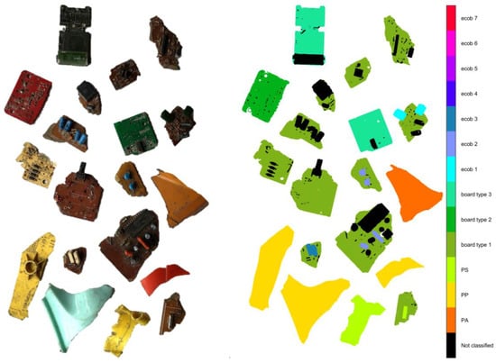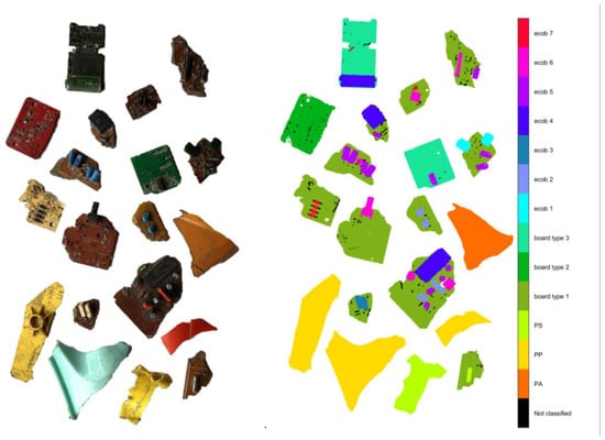 By assuming that all unclassified objects are objects consisting of composite materials, the classification of clusters can be refined in the next step. The knowledge about the objects allows us to adapt our approach to the characteristics of the objects; in this case, circuit boards. That means, the PCBs are separated into individual parts consisting of the board (a plane surface) and the individual electronic components on the board (ecob). The separation between board and components is based on plane estimation [34], while the components on the board are again processed based on Euclidean distance clustering. Next, once again, a rule check of the average spectra for each cluster (board and board components) is carried out. As a result (see example shown in Figure 13) the areas that were divided into boards and components can now be subdivided according to their material properties. In the example dataset, we thus obtain a classification of three different board types, three different types of capacitors and a connector consisting of the material polystyrene (PS).