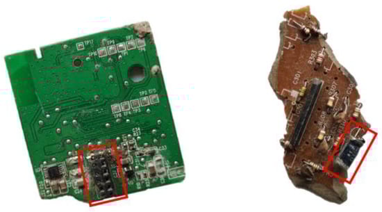 All other existing components do not provide clean spectra that can be used for classification, either because of the black coloring (high absorption) or because of the material composition (metals). However, they are surrounded by detected and classified elements. This relation can be expressed by geometric and topological features allowing to further refine the classification. Figure 14 shows an example of results where a total of four additional groups of components were classified. The four groups include round capacitors, rectangular planar objects (such as microchips), resistors and other components (such as potentiometers and connectors). Especially in this case of classification based on geometric features, it can be seen that the classification of board components is challenging, particularly when dealing with dirty and damaged elements. Even though most of the components have been correctly classified, it can be seen, for example, that one of the connectors has been assigned to the class of radial capacitors (ecob 5). This is due to geometrical similarities shown in Figure 15.