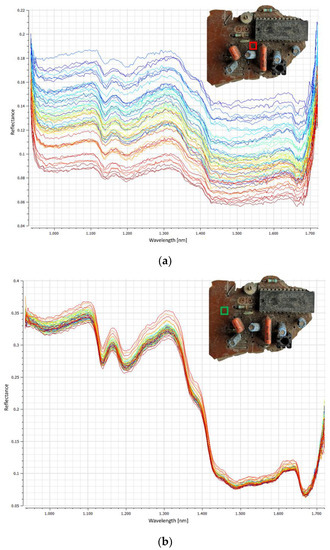 Figure 17. Influence of dirt on the reflectance of spectral signatures. (a) Spectra of a heavily polluted area (red box). (b) Spectra of areas without dirt (green box).